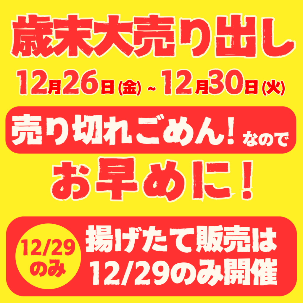 HOME > イベント情報 > イベント情報 【和牛の道の駅/福永畜産直売所】12月26日~12月30日は歳末大売り出し 2025年12月9日 寒い日が続いていますが、皆さま体調など崩されていませんか?あわただしい時期ですので、どうぞ無理されずお過ごしくださいね😊 さて! 今年も歳末 大売り出しを開催いたします! 📅 12/26(金)〜12/30(火) ⏰ 9:00~17:30 毎年人気のため、“売り切れごめん!” となりますので、お早めに✨さらに! 🍳 揚げたて販売は12/29(月)のみの限定開催! 皆さまのご来店を、お待ちしております♪ Post Share Pocket Hatena LINE URLコピー -イベント情報